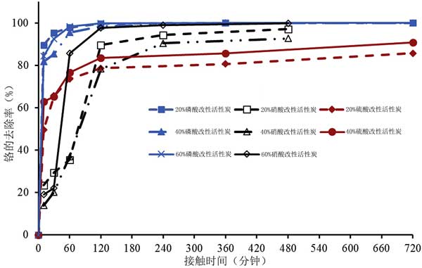 吸附物與活性炭的接觸時(shí)間對(duì)吸附效果的影響很大,在接觸過(guò)程中鉻的去除從0到10分鐘急劇增加,然后從10分鐘減慢到120分鐘,最終在硫酸改性的吸附劑中從120到720分鐘達(dá)到平衡。用磷酸改性的吸附劑觀察到相同的趨勢(shì),但是在60分鐘時(shí)更早達(dá)到平衡,而對(duì)于硝酸改性活性炭,平衡似乎在240和480分鐘之間達(dá)到。去除百分比沒(méi)有明顯差異從120到720分鐘。除了更快的去除動(dòng)力學(xué)之外,磷酸改性的吸附劑顯示出比硫酸和硝酸改性的對(duì)應(yīng)物更高的去除百分比,從0到120分鐘。據(jù)預(yù)測(cè),無(wú)機(jī)酸在浸漬過(guò)程中會(huì)穿透活性炭孔隙,一旦加熱到高溫,它們就會(huì)通過(guò)孔隙與萃取劑一起逸出,留下互補(bǔ)的孔隙。留下的通道通過(guò)與所得官能團(tuán)的物理和化學(xué)相互作用幫助吸收吸附物。出于均勻性原因,選擇12小時(shí)并用作后續(xù)實(shí)驗(yàn)的最佳時(shí)間。