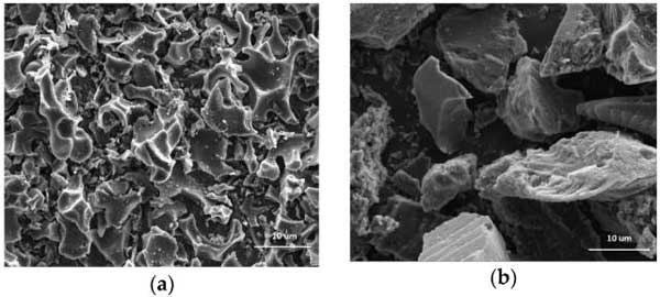 圖1:通過用(a)氫氧化鉀和(b)磷酸化學(xué)活化活性炭的微觀結(jié)構(gòu),通過SEM分析估計(jì)。