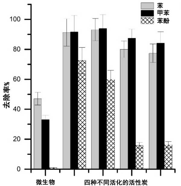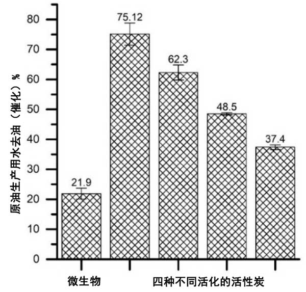 簡而言之,使用活性炭(60%-93%)和載微生物活性炭(16%-84%)比游離的無活性炭載體的微生物(1%-47%)更好地去除芳香烴。材料的孔隙率和吸附偶極性有利于吸附。常規(guī)活性炭表現(xiàn)出高度的微孔性,其中可以容納分子量約為100的苯,甲苯和苯酚;钚蕴康姆菢O性特征保證了碳?xì)浠衔锏氖杷,也是非極性的;钚蕴筷栯x子表面有利于芳烴保留,因?yàn)榉辑h(huán)中的π電子與表面陽離子靜電連接。使用常規(guī)活性炭和載微生物活性炭的原油去除能力如圖3所示。使用游離的微生物和油-鹽水乳液作為對照。