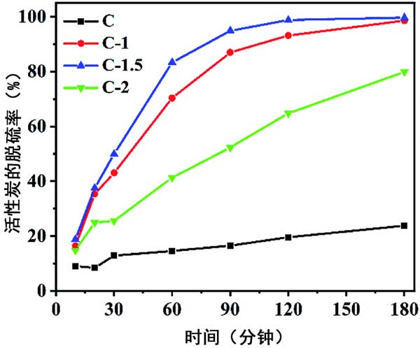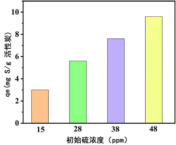 基于以上結構表征和實驗結果,得出了吸附機理。戊硫醇分子中的強路易斯酸S原子與活性炭中來自氧原子的一對電子相互作用。大孔和中孔的存在有助于活性炭的比表面積增加,暴露出更多的內部原子,并促進了質量傳遞,從而使吸附劑易于與硫化物接觸。關于炭1.5的工業(yè)應用前景,考慮了硫的初始濃度對吸附性能的影響。如圖3所示,對于初始含硫量分別為15、28、38和48 ppm的模型燃料,炭1.5的平衡吸附容量為每克吸附劑3.0、5.6、7.6和9.6 mgS。值得注意的是,在此濃度范圍內,吸附劑的硫去除率高于97%。這組結果表明該材料對于去除低濃度的硫化物具有明顯的工業(yè)應用價值。