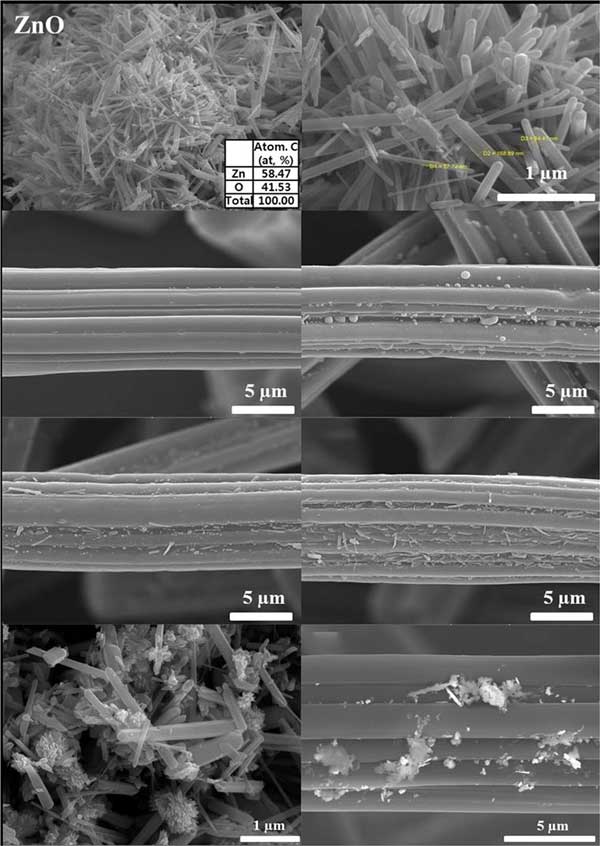 圖1:摻雜ZnO的活性炭纖維以及與活性炭結(jié)合的CuO-ZnO的FE-SEM圖像。