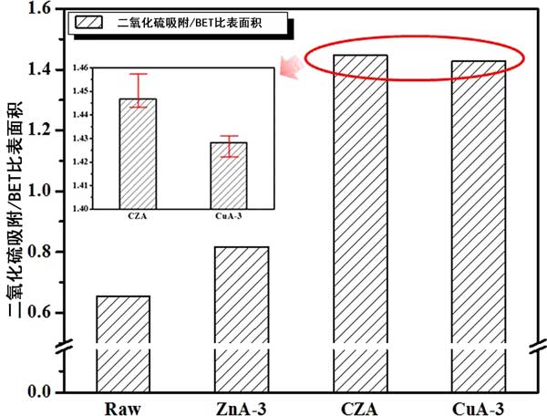 二氧化硫吸附至BET表面積的比較