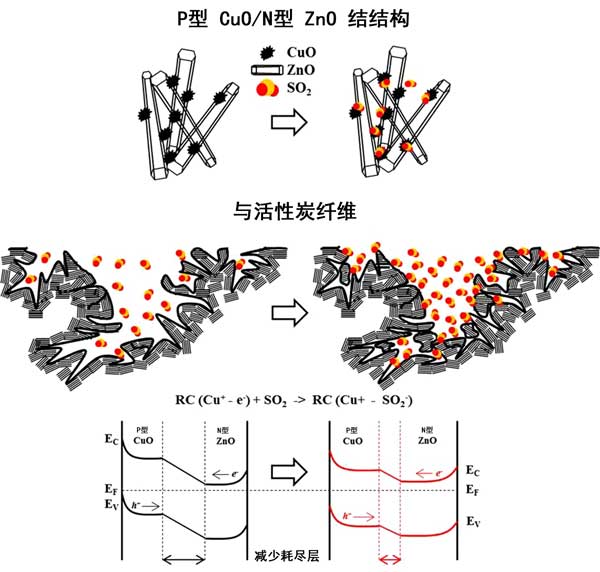 在圖3中,CuO顆粒隨機分散在ZnO花表面上。當CuO顆粒與ZnO花結(jié)合時,在p型CuO顆粒和n型ZnO花之間的界面處形成p/n結(jié)。在這種機制下,電子從n型ZnO轉(zhuǎn)移到p型CuO,并且空穴通過p型CuO到達n型ZnO,直到在系統(tǒng)中建立均勻的費米能級,從而導致能帶在耗盡層彎曲。然而,當CuO-ZnO組合結(jié)構(gòu)暴露于SO 2時,電子通過Cu +之間的氣敏反應釋放和SO帶負電的2 -離子。還原的SO 2分子與CuO中的孔結(jié)合,從而減少了耗盡層和電阻。這種現(xiàn)象可通過降低電阻來實現(xiàn)良好的SO 2檢測。因此,p型CuO和n型ZnO的傳感響應的貢獻代表了傳感器的主要特性,而活性炭纖維的比表面積在SO 2傳感特性中起著重要的作用。