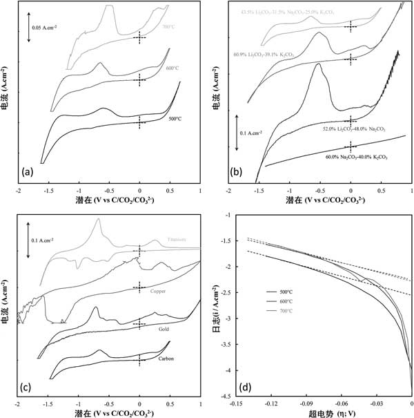圖1:(a)活性炭的溫度,(b)發(fā)生沉積的熔融碳酸鹽電解質,以及(c)發(fā)生沉積的基板。(d)與在500-700°C的溫度下沉積的碳的碳沉積開始有關的Tafel峰的陰極Tafel曲線和計算的Tafel線(虛線)。