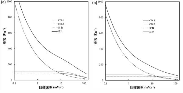 圖4:掃描速率對(a)以活性炭和其他標準條件以及(b)活性炭對總電容的貢獻的影響。C D表示由于擴散引起的電容,而C DL1和C DL2分別表示與納米和微孔表面積以及外部碳表面積相關的雙層。
