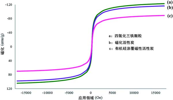 在這項研究中使用VSM來檢查合成活性炭的磁強度。對Fe 3 O 4顆粒,磁性活性炭和機硅涂覆磁性活性炭進行了研究,以研究它們在涂覆時的磁強度趨勢。幾種材料的磁滯回線分別示于圖1(a)-(c)。根據(jù)獲得的結(jié)果。由于存在非磁性活性炭和有機硅表面活性劑涂層,磁強度似乎下降了。這確認涂覆過程成功。但是,盡管在涂覆最終材料機硅涂覆磁性活性炭時磁化強度降低,但其磁強度仍在可接受的范圍內(nèi),并且強度足以在吸附過程中進行。