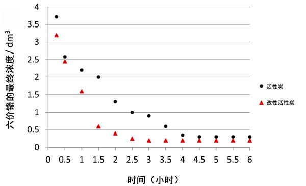 從獲得的測試結果可以得出結論,吸附時間對特定碳的鉻(VI)去除效率具有顯著影響。鉻酸根離子相對于活性炭的最大還原發(fā)生在4.5小時后。在硝酸改性活性炭上去除鉻的速率更高,并且在2.5 h后發(fā)生了吸附平衡時間。然后進行穩(wěn)定化處理,并進行進一步測試(確定等溫線),發(fā)現(xiàn)該接觸時間為不同的活性炭通常不超過6小時。
