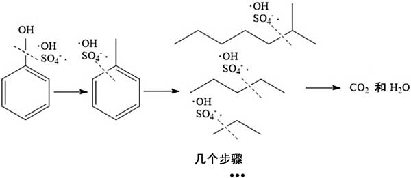 圖4顯示了苯酚的降解過(guò)程。首先破壞連接苯酚中羥基的化學(xué)鍵,然后打開(kāi)苯環(huán)以形成通過(guò)單鍵連接的單鏈。隨著反應(yīng)的進(jìn)行,單鏈之間的化學(xué)鍵被破壞,并形成具有較少碳原子數(shù)的單鏈。將鏈重組為新的長(zhǎng)鏈的過(guò)程是由于氧化劑劑量不足。然而,隨著反應(yīng)的進(jìn)行,諸如這些短鏈和新形成的長(zhǎng)鏈的中間體被進(jìn)一步降解。在此過(guò)程中,一些單鏈會(huì)隨著反應(yīng)時(shí)間的增加而重組形成一條更長(zhǎng)的新單鏈。隨著這一過(guò)程的繼續(xù),長(zhǎng)單鏈逐漸分解成短鏈,然后苯酚礦化成二氧化碳和水。