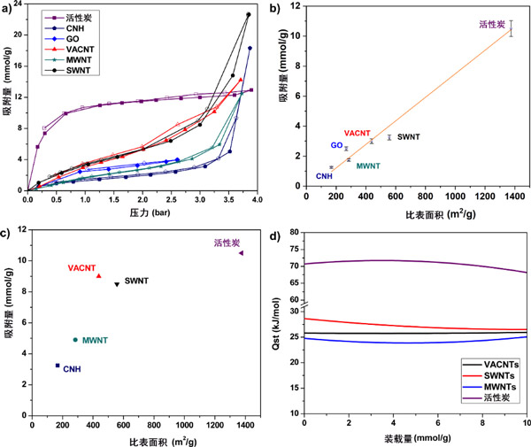 圖1顯示了不同吸附劑的示意圖。活性炭具有無序的孔結(jié)構(gòu)(圖1a),其孔隙度是由基本結(jié)構(gòu)單元的無規(guī)堆積引起的,該結(jié)構(gòu)單元可能是小于10-20環(huán)的平面芳族結(jié)構(gòu),分布在2-4層上或有缺陷的微石墨烯層。具有這種形態(tài),它代表具有擴(kuò)展的結(jié)構(gòu)紊亂的類型學(xué)碳吸附劑。氧化石墨烯具有2D分層結(jié)構(gòu),如圖1b所示。合成氧化石墨烯的起始材料是石墨,石墨的氧化引入了氧官能團(tuán),繼而增加了層間距并使材料變成親水性。隨后的剝落步驟將各層分開,從而顯著增加其可訪問的表面積,從而導(dǎo)致單層或少層氧化石墨烯的形成。在我們以前的工作中,通過XPS分析,我們發(fā)現(xiàn)氧化石墨烯上存在的氧官能團(tuán)是羥基和羧基的形式。材料在孔隙率和功能化程度方面的可調(diào)性使氧化石墨烯成為親水性碳吸附劑的原型,因此對(duì)于研究2D材料中的氣體吸附也很有趣。碳納米角具有管狀結(jié)構(gòu),在一端具有封閉的錐形尖端結(jié)構(gòu)(圖1c)。單個(gè)碳納米角通常為單壁,內(nèi)徑為2-4 nm。碳納米角的獨(dú)特特征是直徑為50–100 nm的剛性球形聚集結(jié)構(gòu)。合成后的碳納米角關(guān)閉,氣體分子無法進(jìn)入碳納米角內(nèi)部。氧化處理,例如在空氣中加熱,O 2 或CO 2用于打開碳納米角,從而將可及表面積增加3-4倍。碳納米角具有微孔的組合,對(duì)于氣體吸附應(yīng)用很有趣,因?yàn)樗鼈兛梢源罅可a(chǎn)且純度高。