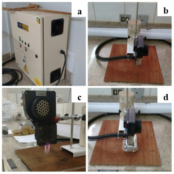 圖1:電擊設(shè)備(a)控制箱、(b)電擊頭、(c)排放頭、(d)表面處理布置。