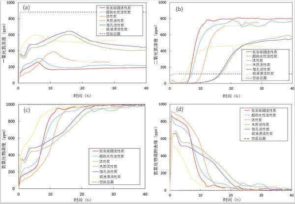 為了測(cè)試活性炭在環(huán)境溫度下對(duì)氧化和去除的催化和吸附性能。這些簡(jiǎn)化的條件與實(shí)際煙氣條件大不相同,后者具有不同的成分和雜質(zhì),并且在不同的壓力和溫度下。但是,這些條件使我們能夠簡(jiǎn)化復(fù)雜的系統(tǒng),以更好地了解NO氧化。圖中顯示了在干燥條件下,環(huán)境溫度和壓力下不同活性炭在NO氧化過(guò)程中NO,NO 2和氮氧化物的濃度分布圖。NO氧化轉(zhuǎn)化率與運(yùn)行時(shí)間的關(guān)系也可以由NO濃度來(lái)計(jì)算的。還計(jì)算了每個(gè)給定時(shí)間的NO入口和氮氧化物出口濃度之間的差異,并顯示為通過(guò)吸附去除的氮氧化物量;測(cè)試代表在相同條件下通過(guò)使用無(wú)活性炭催化劑的空反應(yīng)器進(jìn)行的測(cè)試。穩(wěn)態(tài)NO轉(zhuǎn)化率,氮氧化物的累積量吸附,以及所需要的時(shí)間,以達(dá)到最大的NO濃度或吸附的突然釋放NO 2的出口流中還從濃度曲線中獲得了這些元素。