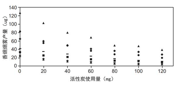 測試過程中我們在無炭和以20毫克至120毫克的六種重量增量添加活性炭來測試香煙。桿端和嘴端的醋酸纖維素長度段始終保持恒定。最大的空腔填充值用于所有負(fù)載,因此,總的過濾器長度增加了約50%。每使用15毫克活性炭增加1毫米。如前所述,所有香煙都在35/2/60的條件下進(jìn)行調(diào)理和抽煙。每個濾嘴負(fù)載量高為120mg時添加活性炭對焦油和尼古丁的收率(即顆粒相)的影響很小,這可能是由于較長的濾嘴導(dǎo)致了額外的機(jī)械過濾。對于所有測得的蒸氣,隨著活性炭載量的增加,產(chǎn)率都有所下降。這在圖1中以圖形方式顯示(僅出于清晰目的使用一定范圍的蒸氣),其中乙醛/丙酮值乘以0.1以進(jìn)行縮放。