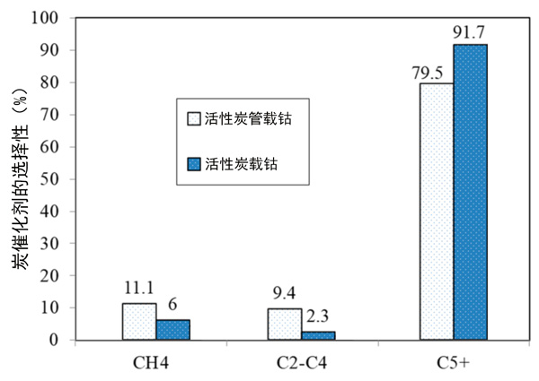 費托合成試驗是在210℃和2.5MPa的內(nèi)徑為12mm的不銹鋼固定床管式反應(yīng)器中進行的。將0.5g催化劑與5.0g碳化硅稀釋劑的反應(yīng)混合物裝入反應(yīng)器中。催化劑在425℃下在N2中的33vol%H2中原位還原10小時。還原后,將反應(yīng)器冷卻至180℃,并將H2/N2氣體混合物切換為合成氣(H2:CO為2∶1)。在合成氣加壓至2.5MPa然后在4小時內(nèi)重新加熱到210°C來完成反應(yīng)。活性炭載鈷催化劑,活性炭納米管載鈷催化劑的CO轉(zhuǎn)化率分別為13.1%,6.7%。產(chǎn)物選擇性的結(jié)果在圖2中給出。與活性炭管樣品相比,活性炭產(chǎn)生更高的C5+和更低的CH4選擇性,這對氣體產(chǎn)物(C1-C4)也產(chǎn)生最高的選擇性。
