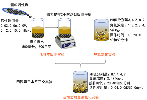 根據(jù)以前的單個活性炭吸附和臭氧化實驗的結(jié)果,設計了四個因素和三個水平的正交實驗,討論模擬廢水的色度和COD cr去除效果并確定最佳實驗參數(shù)。具有操作條件的實驗程序設計流程圖如圖2所示。