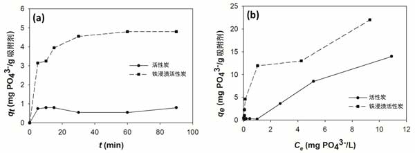 圖3:(a)磷酸鹽在活性炭和浸漬活性炭上的吸附動力學,以及(b)對磷酸鹽的吸附等溫線。